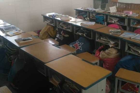 随着铃声响起全体教师迅速到达指定位置,学生则按要求抱住头颈部,蹲在课桌底下,进行躲避。